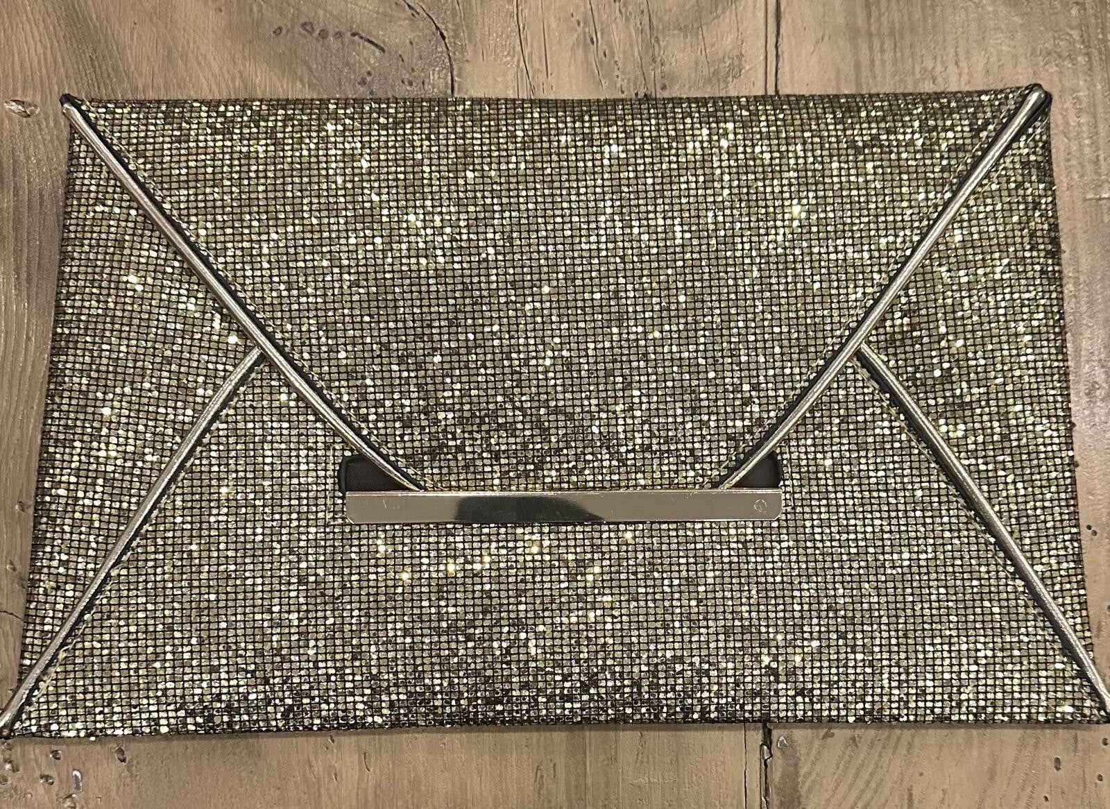Pochette enveloppe pailletée dotée d'une fermeture à rabat, avec une barre métallique dorée