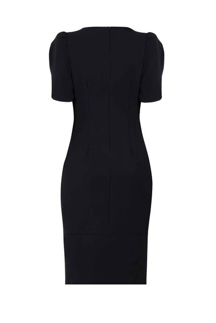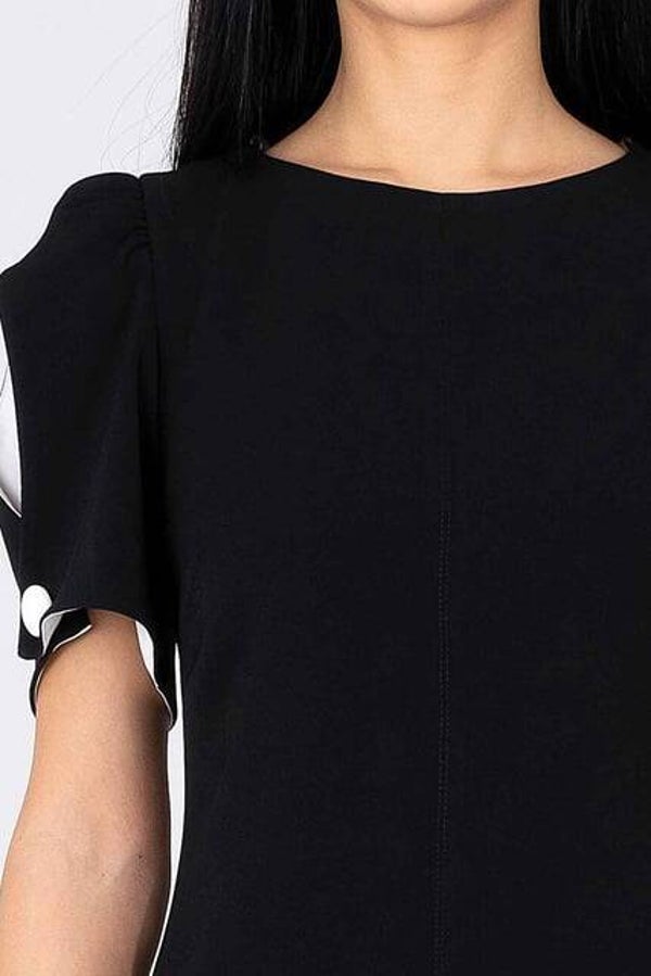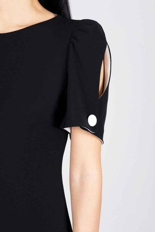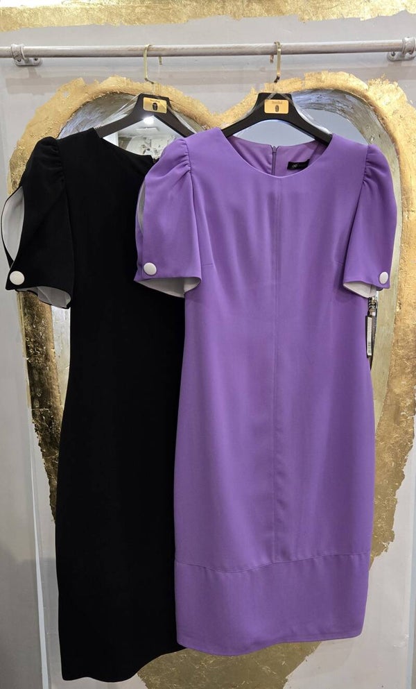ROBE JACKIE EN CREPE BI-COLOR AVEC BOUTON RECOUVERT SUR LA MANCHE.