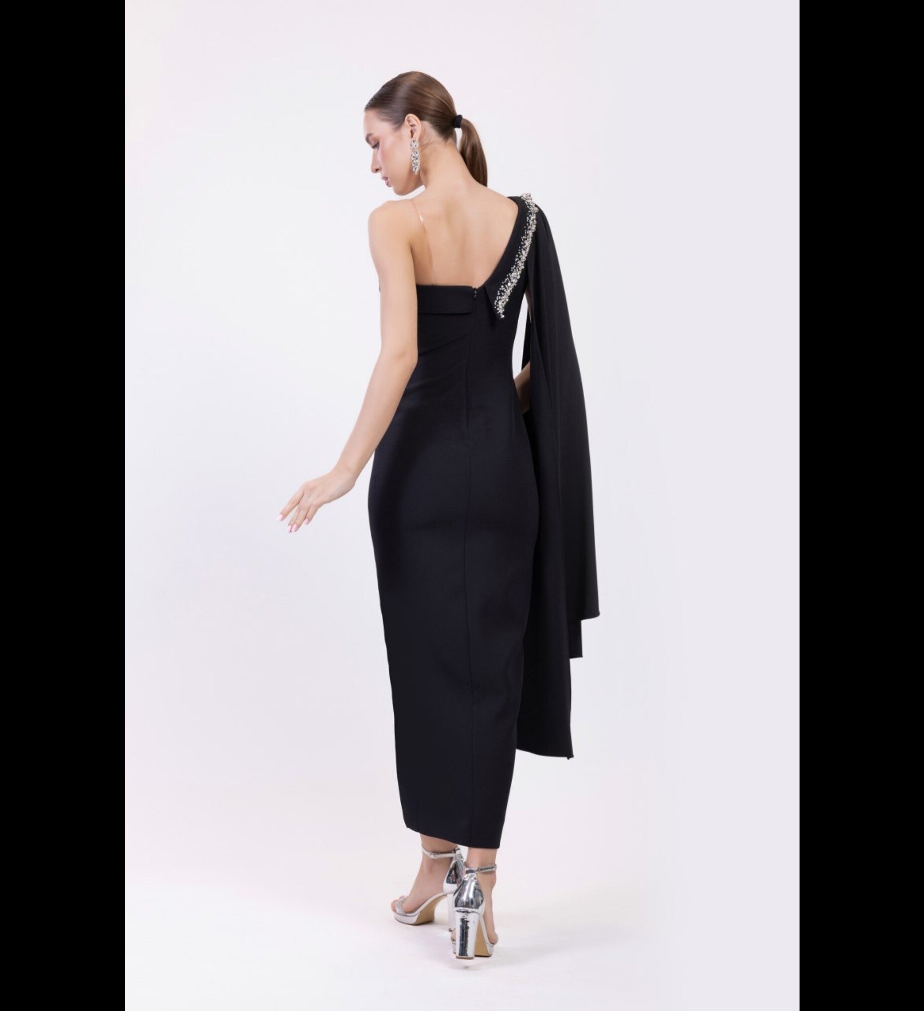 ROBE DE SOIREE EN CREPE EXTENSIBLE AVEC REVERS STRASS ET PERLES.