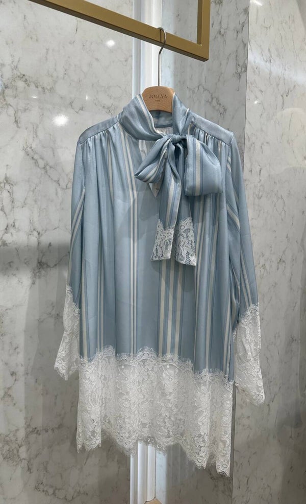 ROBE AMPLE ENCOLURE NOEUD EN SATIN IMPRIME ET DENTELLE